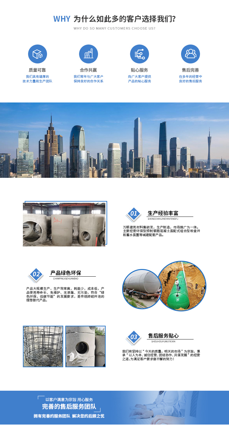黃山市萬順建筑科技有限公司是集研發(fā),生產(chǎn)制造,市場(chǎng)推廣為一體的綜合性企業(yè)。公司主要經(jīng)營(yíng)環(huán)保型預(yù)制鋼筋混凝土裝配式組合型檢查井和蓄水裝置等城建配套產(chǎn)品。產(chǎn)品生產(chǎn)過程采用獨(dú)特的生產(chǎn)工藝,機(jī)械化流水作業(yè)。產(chǎn)品大規(guī)模生產(chǎn),生產(chǎn)效率高,耗能少,成本低,產(chǎn)品使用壽命長(zhǎng)、免維護(hù)、無滲漏、無污染,符合“綠色環(huán)保,低碳節(jié)能”的發(fā)展要求,是傳統(tǒng)磚砌井池的理想替代產(chǎn)品。